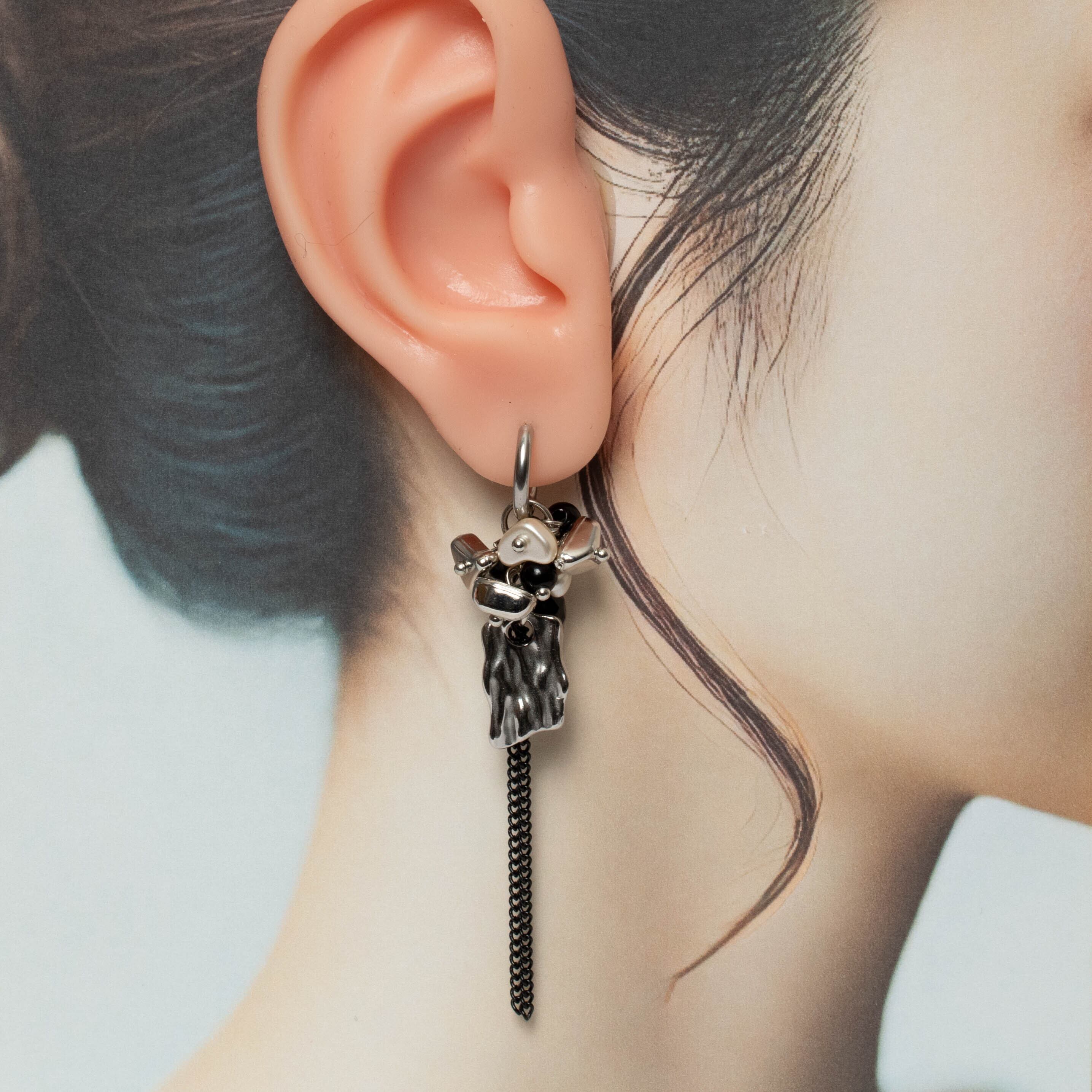 二連のブラックチェーンとシルバーフープが昇華した、モダンでスタイリッシュなピアスです✨