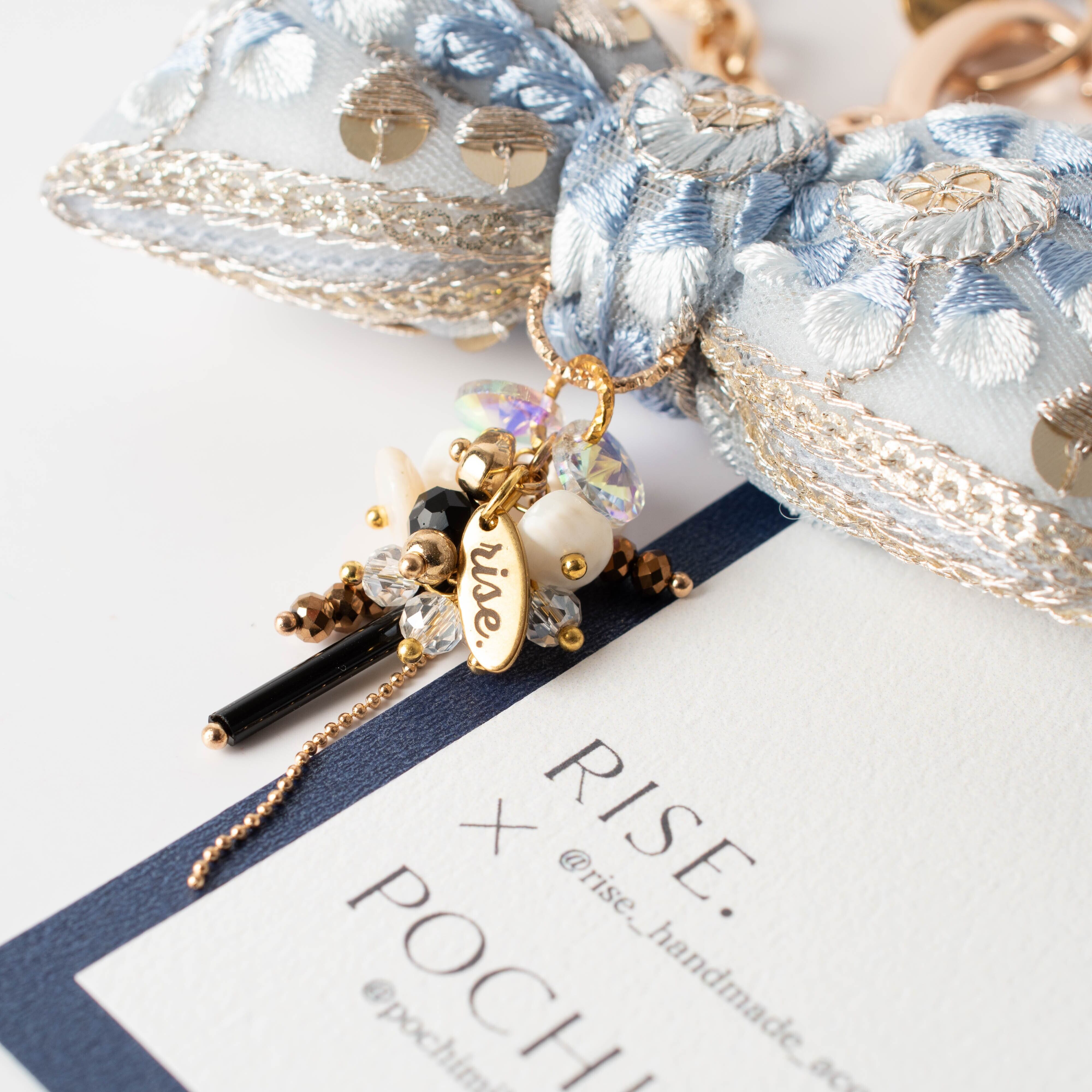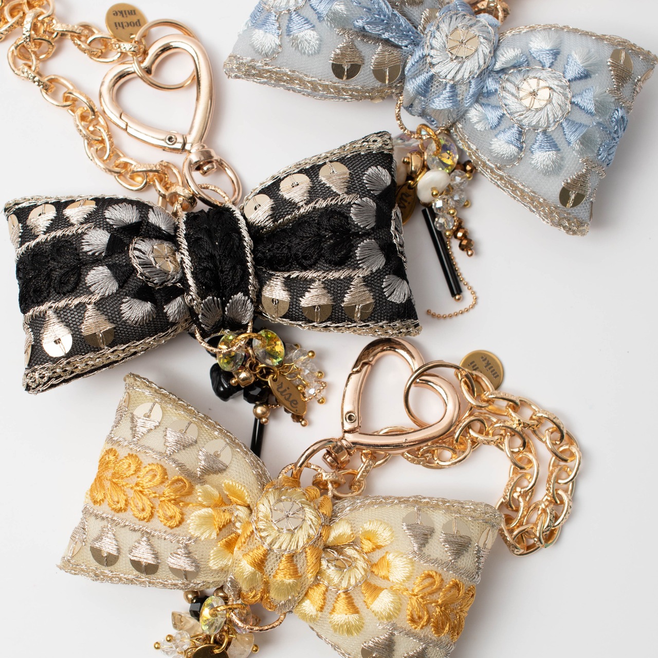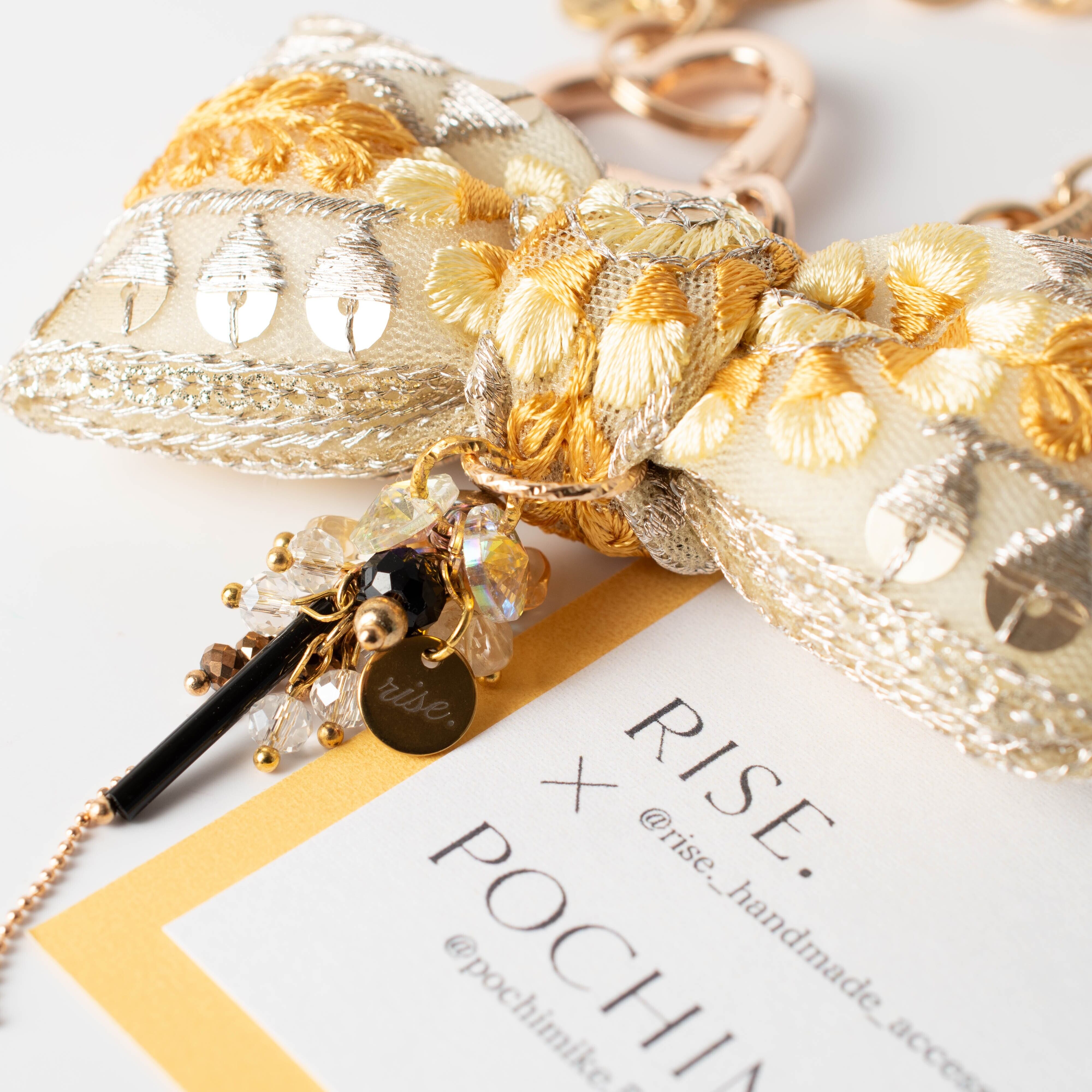 インド刺繍リボンのぷっくりチャームや接続金具部分をpochimikeが担当。